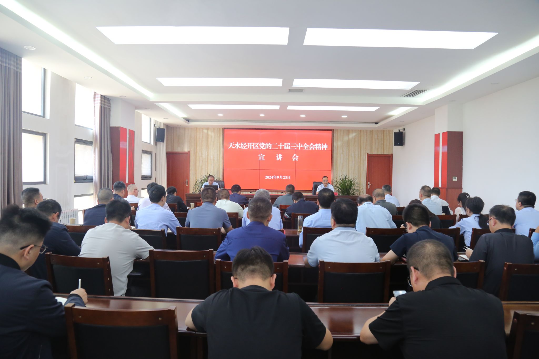 9月23日下午,天水经济技术开发区召开党的二十届三中全会精神宣讲会,邀请市委讲师团成员、市委政策研究室副主任成雪峰做宣讲。党工委副书记,纪检监察工委书记于爱平主持会议。管委会班子成员、各部门、单位、派驻机构负责同志及各支部书记参加了会议。