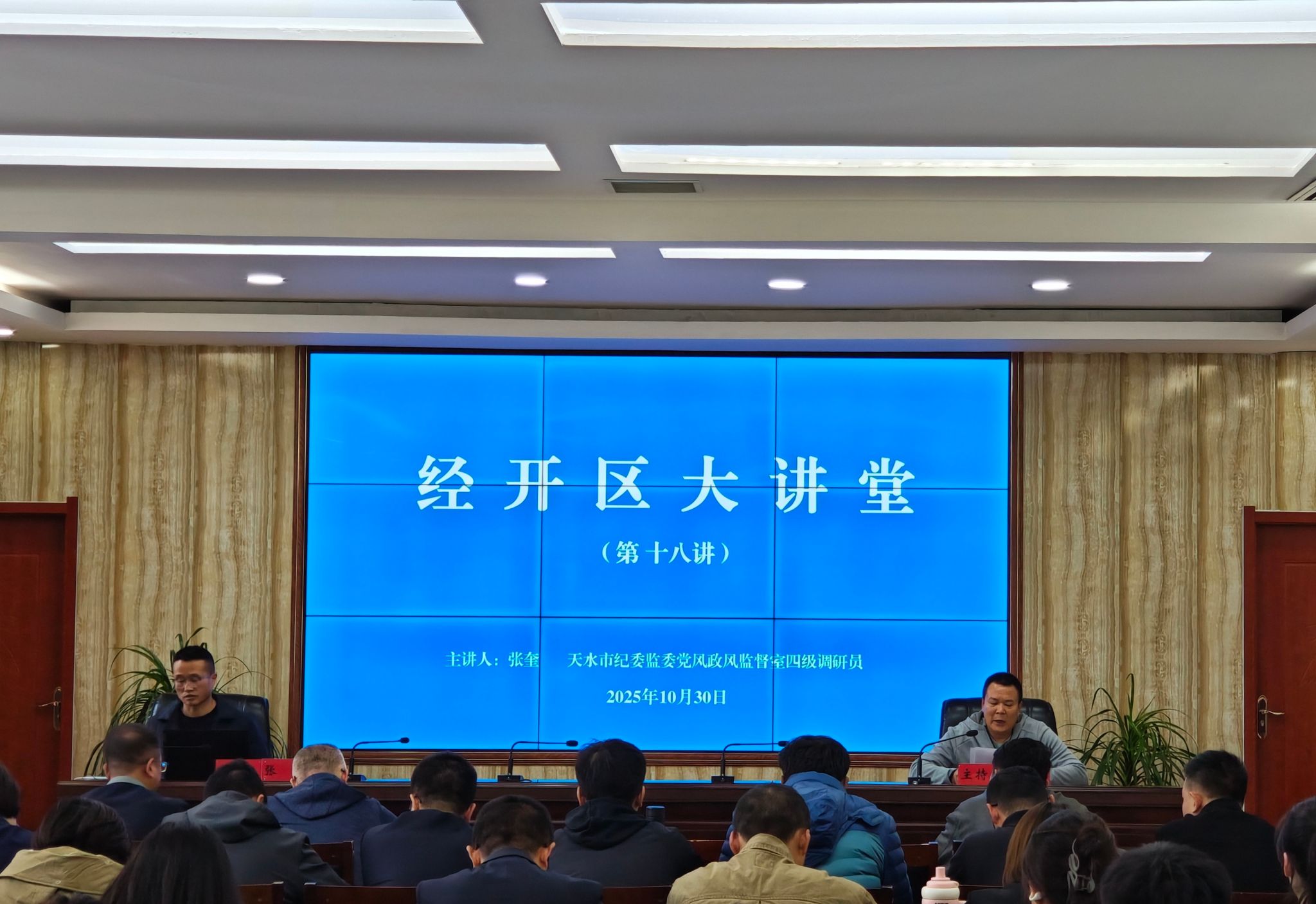 10月30日下午,天水经开区举办了第十八讲“经开区大讲堂”,邀请天水市纪委监委四级调研员张奎作辅导。辅导讲座由经开区管委会四级调研员刘伟主持,经开区各基层党组织书记、党务工作者、新发展党员和管委会各部门、单位干部职工共计 90余人参加。