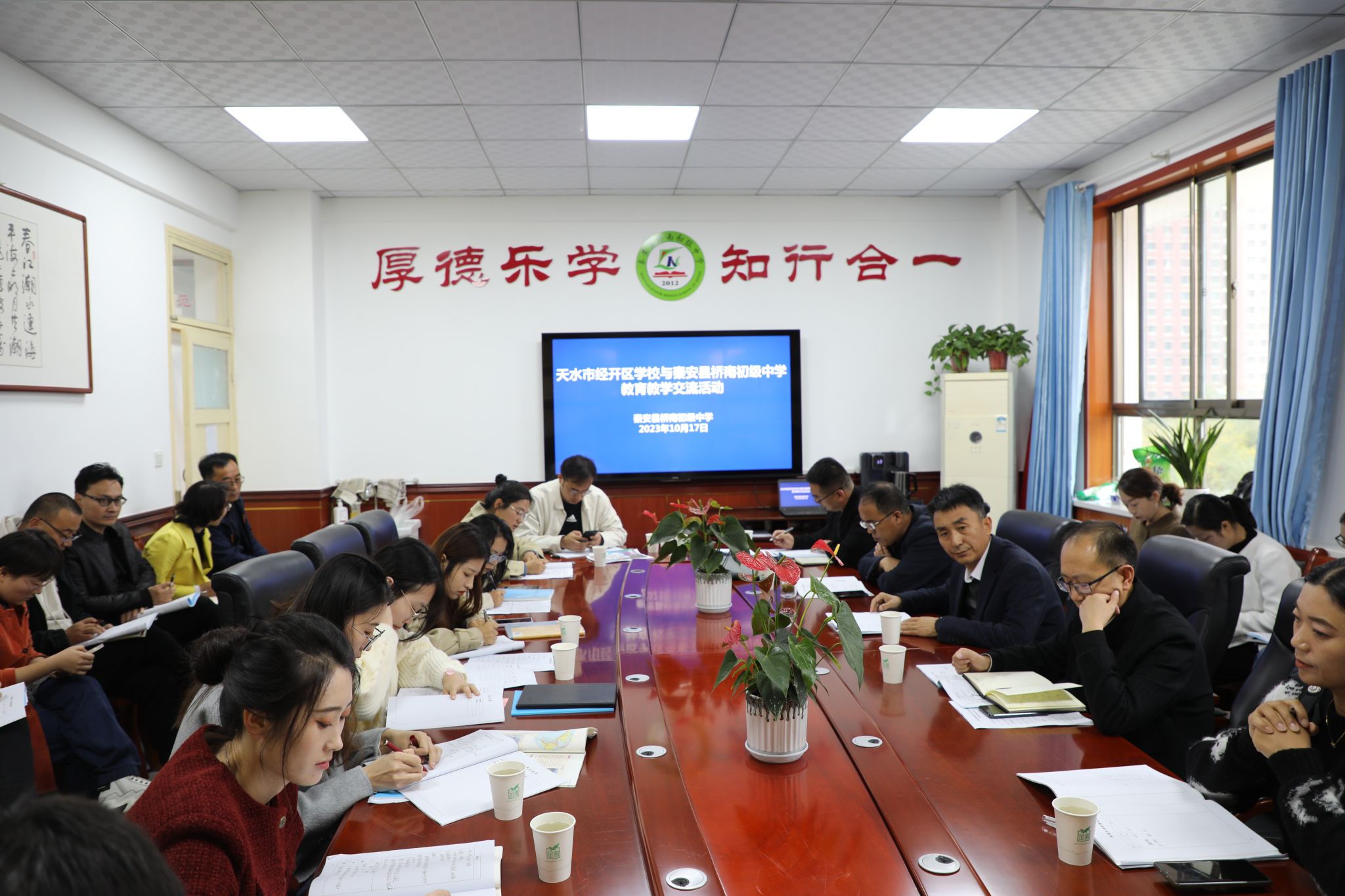 交流过程中,经开区学校教师详细了解了秦安县桥南初级中学办学历史、基本情况、校园文化、办学特色与办学成效等。同时,全体交流活动参与教师深入七年级组各年级,开展了学科听课、教研交流活动。活动最后,双方单位负责人就办学概况、管理模式、校园文化建设、亮点和成效等方面进行深入交流学习。