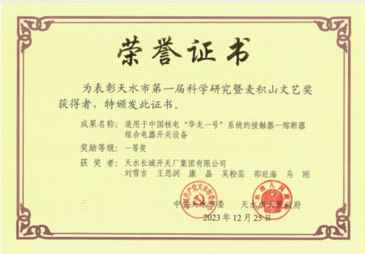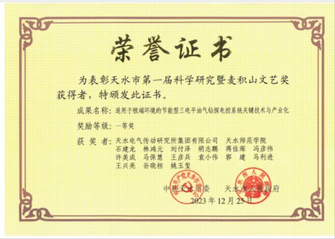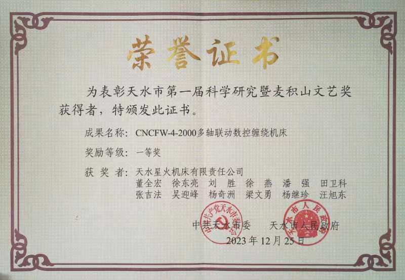 近日,在天水市第一届科学研究暨麦积山文艺奖表彰大会上,天水经开区8项成果6个单位受到表彰奖励,其中“适用于中国核电‘华龙一号’系统的接触器—熔断器组合电器开关设备”“CNCFW-4-2000多轴联动数控缠绕机床”“适用于极端环境的节能型三电平油气钻探电控系统关键技术与产业化”3项成果荣获一等奖,“智能测控一体化闸门”等4项成果荣获二等奖,“CNC850/3m数控精密车削中心”1项成果获三等奖。