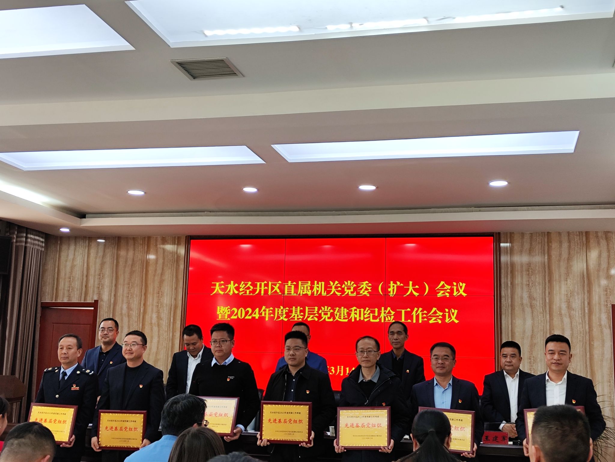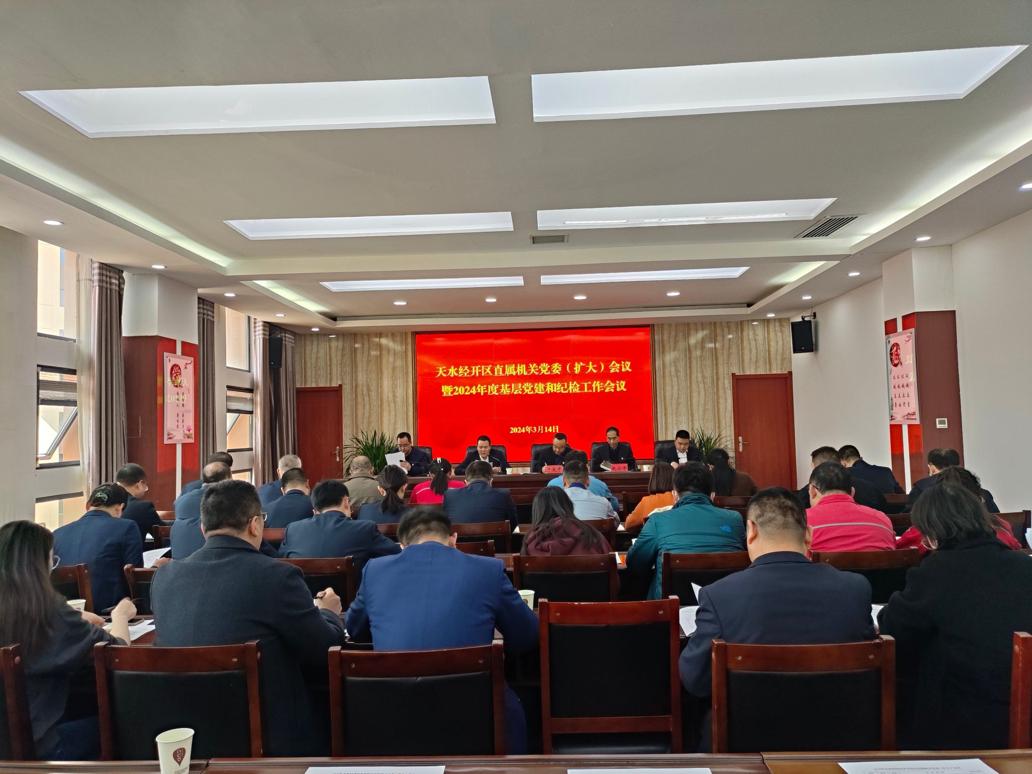会议传达了中央党和国家机关党的建设暨纪检工作会议、胡昌升同志在省委直属机关工委调研时的讲话、省市直机关党的工作暨纪检工作会议精神,通报了2023年度基层党组织书记述职评议考核及支部工作考核情况,表彰奖励了2023年度经开区基层党建工作考核先进基层党组织,税务局机关党委、管委会机关第一支部、兴阳建设公司党支部、中节能(天水)环保能源公司党支部书记分别作了经验交流发言,对经开区2024年党建工作和直属机关纪检工作进行了全面安排部署,直属机关党委与各基层党组织书记签订了2024年党建和纪检工作、意识形态工作目标责任书。
