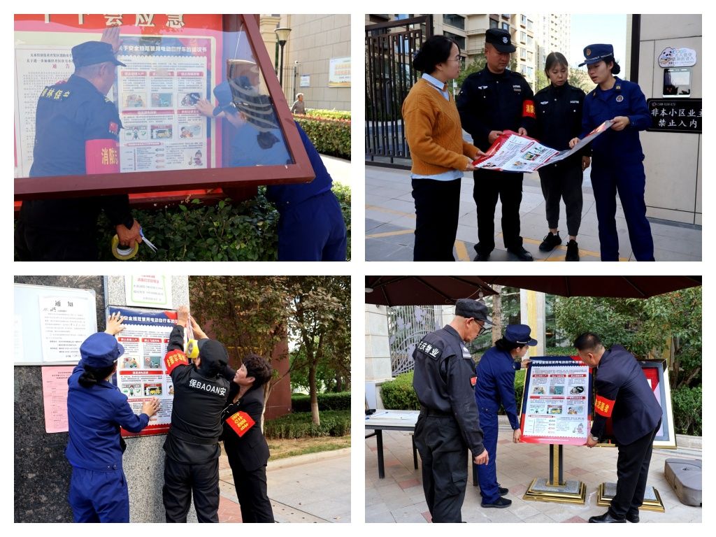 活动中,消防宣传人员联合消防志愿者、物业人员走进住宅小区,将电动自行车安全提示海报张贴在公示栏、电梯入口、门厅等醒目位置,让广大群众出入时都可以看到提示海报,使其在潜移默化中认识到电动自行车上楼入户、乱停乱放的危险性。在张贴宣传海报的同时,宣传人员还向各小区物业及过往群众耐心细致讲解了消防安全知识,叮嘱物业加强管理,做好居民提示宣传工作,提醒群众不要将电动车停放在门厅、楼道内,不要占用消防车通道,不要将电动自行车驶入电梯、上楼入户,避免火灾事故的发生。