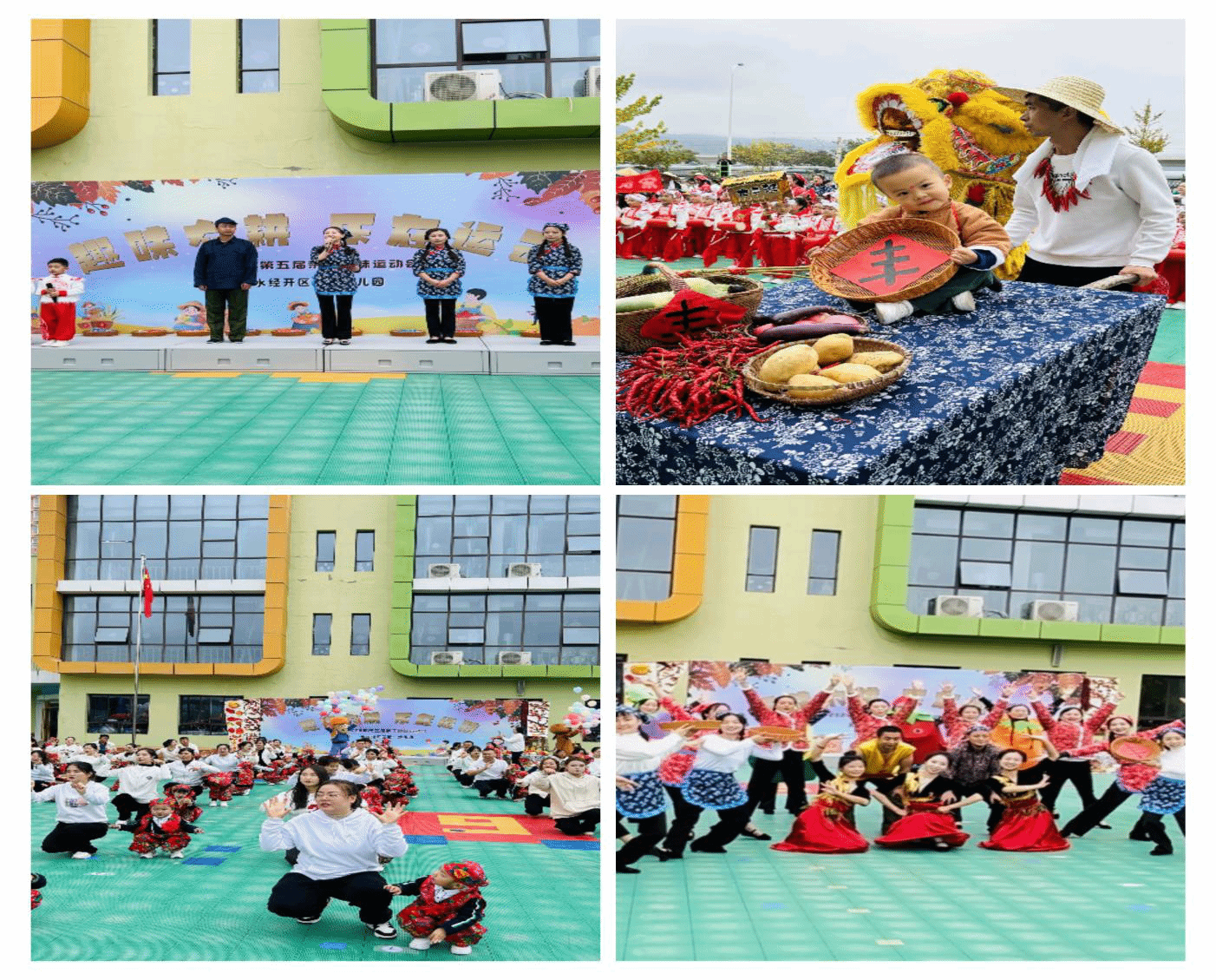 运动会在庄严的升旗仪式和王园长精彩的开幕辞中正式开始。各年级奉献了精彩的团体操表演,中班级的团体操《欢天喜地庆丰收》、小班级的亲子团体操《挖哩挖哩》、大班级的团体操《鼓韵欢舞》,团体操不仅展现了孩子们的团队协作精神,更体现了他们积极向上的风貌。教师的小品《红高粱模特队》,既让大家看到了幼儿园教师们的多才多艺,也为大家带来了欢乐。全园游戏《抢收乐》,更是将趣味运动会的气氛推向了高潮。游戏中,家长在规定时间内以接力的形式争先恐后为自己的班级抢运瓜果蔬菜,既给孩子们展示了团结就是力量的道理,也起到了言传身教的作用。各班级游戏区域设置了多个富有趣味性和挑战性的游戏项目,如 “赶鸡入笼”“运蔬菜”“你挣 我抢”“猴子运桃”“‘玉’见美好”等,比赛现场气氛热烈,加油声、欢呼声此起彼伏。孩子们和家长们齐心协力,奋勇拼搏,在游戏比赛中很好地体现出了团队的力量。运动会最后,幼儿园领导为获奖的班级颁发了奖状和奖品,以表彰他们在比赛中的出色表现。