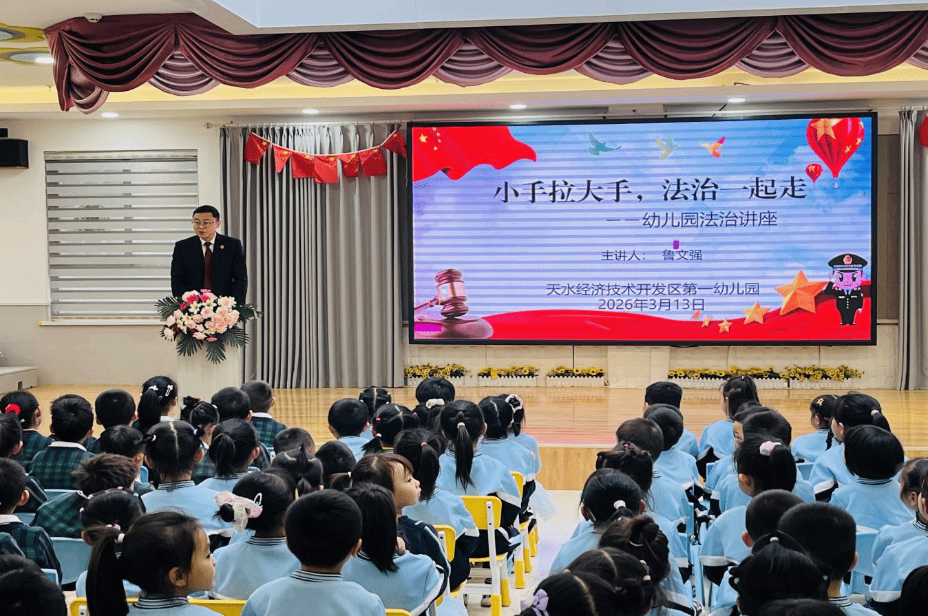 为进一步筑牢校园安全防线,提升师幼法治观念与自我保护能力,守护幼儿健康快乐成长,3月13日上午,天水经开一幼邀请法治副校长鲁文强庭长走进幼儿园,开展了法治安全专题讲座,全园师幼聆听了讲座。