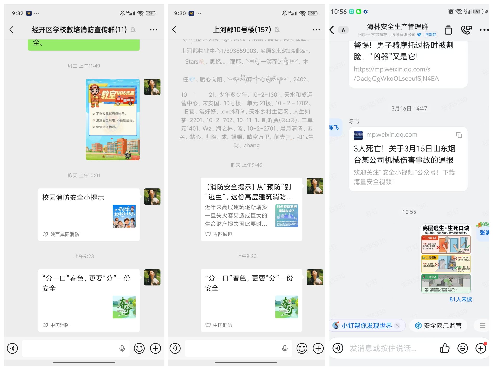 连日来,天水经开区消防宣传人员创新宣传模式,聚焦住宅小区、重点行业、学校三大关键领域,以微信群为载体,开展常态化、靶向性消防安全宣传,让安全知识走进群众指尖、融入日常生活。
