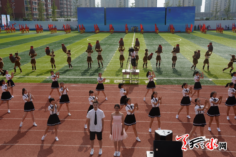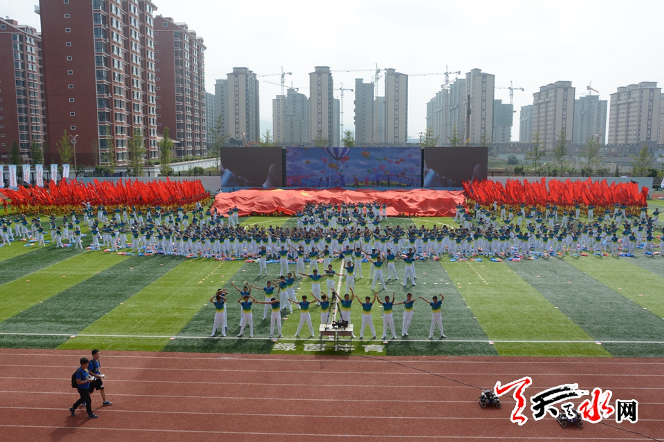 据了解,本届运动会是深入贯彻党中央国务院《关于加强青少年体育增强青少年体质的意见》的具体举措,是对近三年我市中学体育教学成果的一次集中检阅。开幕式团体操是运动会的重头戏,充分展现“健康、阳光、青春、活泼”为特征的校园群体文化。开幕式团体操演出主题为“启航新时代”,由《序》、《薪火相承》、《奔竞不息》、《逐梦未来》、《尾声》五个部分组成。整场演出由天水一中(534人)、天水市体育运动学校(30人)、天水市伏羲中学(420人)、天水市逸夫实验中学(520人)、天水市二中(490人)、天水市四中(520人)、天水市八中(380人)、天水一中麦积校区(80人)八所学校承担,参演总人数约3000人,时长约40分钟。