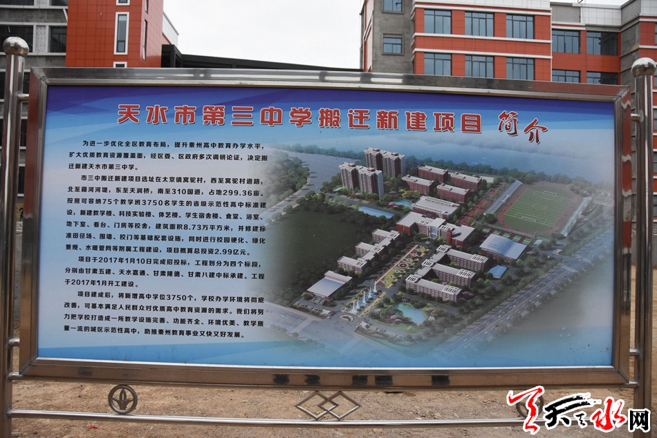 据了解,市第三中学异地搬迁新建项目选址在秦州区太京镇窝驼村,西至窝驼村东面村道路,北至藉河河堤,东至山水大桥,南至310国道,占地299.36亩。项目计划概算总投资2.99亿元,计划新建校舍8.73万平方米,建设规模计划按照可容纳75个教学班3750名学生的省级示范性高中标准建设,新建教学楼、科技实验楼、体艺楼、学生宿舍楼、食堂、浴室、地下室、看台、门房等校舍,并新建标准足球场及400米田径跑道、围墙、校门等基础配套设施,同时进行校园硬化、绿化、水暖管网等附属工程建设。