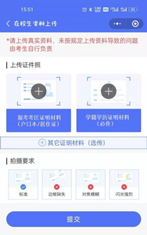 在校生: 1. 需要上传学信网查询的学籍验证码 2. 若无法提供学籍验证码,非当前考区所在地在校生,需要上传其他学籍学历图片证明材料。 3. 上传报考考区范围(户籍/居住证)证明材料 非在校生: 1. 需要上传学信网学籍验证码 2. 选择上传报考考区范围(户籍/居住证)证明材料 |