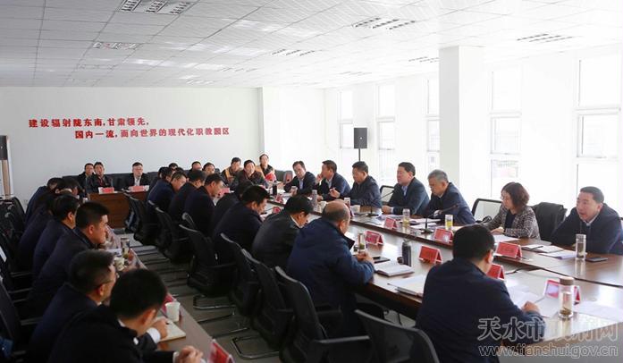 王军首先来到项目施工现场,实地察看工程进度,听取有关情况介绍,随后,主持召开天水市职教园区筹建工作领导小组2019年第四次扩大会议,听取各有关方面负责人对近期工作进展情况的汇报,讨论议定相关事项,并就下一阶段重点工作进行了安排部署。