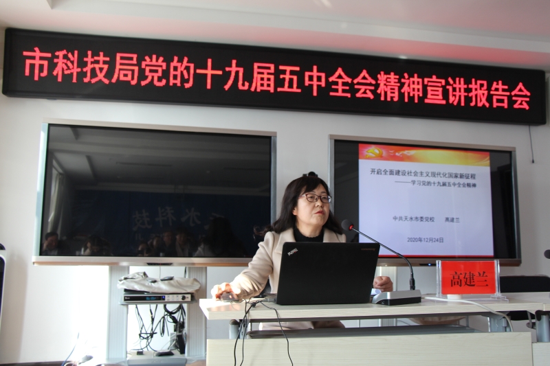 12月24日,市科技局举办学习宣传贯彻党的十九届五中全会精神宣讲会,邀请市委讲师团成员、市委党校副教授高建兰作专题辅导。宣讲会由局党组成员、副局长张靖泰主持,局系统干部职工参加了学习。