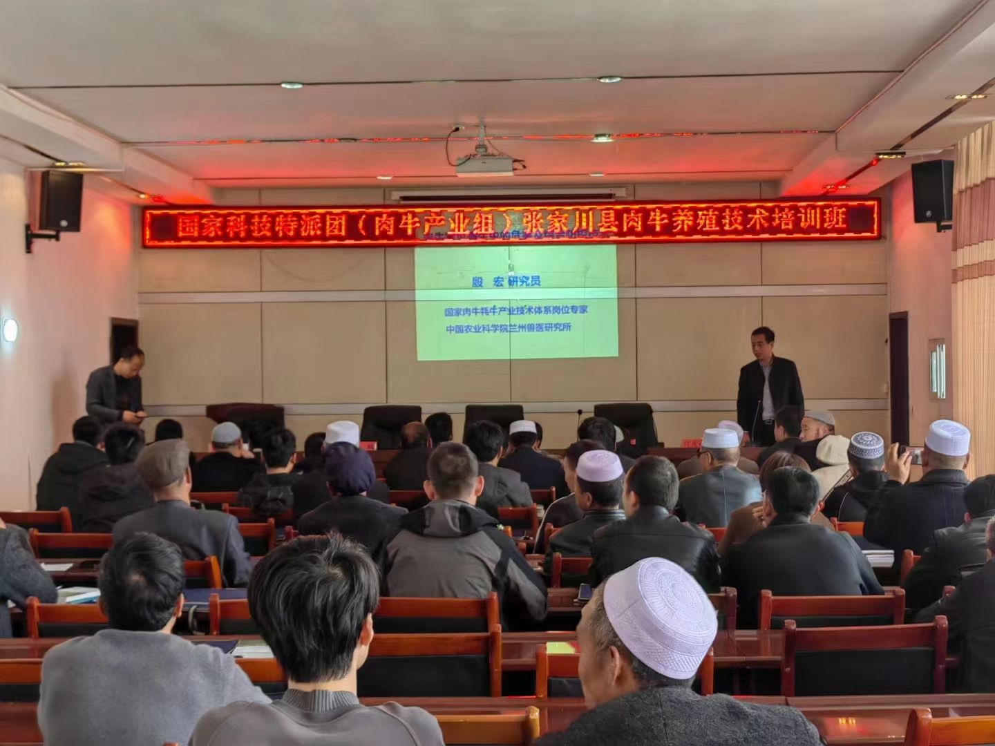 在技术培训班上,肉牛产业组4位专家结合张家川县肉牛产业发展实际和群众所需,分别从肉牛提质增效技术、春季牛呼吸道疾病预防和控制技术、犊牛腹泻与咳喘的中兽医药保健技术、肉牛寄生虫病的危害与防治技术等方面进行了授课和答疑,15个乡镇畜牧技术人员、肉牛养殖场、大户负责人、县畜牧中心技术人员共计100余人参加培训。会后,科技特派团为张家川县肉牛养殖场户发放阿苯达唑、伊维菌素、球虫清等抗寄生虫药物5500瓶(盒),《肉牛高效养殖技术》《放牧牛羊高效养殖综合配套技术》100本。