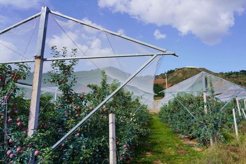 随着防雹网在果园中逐步铺开,这片果林宛如披上了一层坚固的“铠甲”。它像一把巨大的保护伞,将果树笼罩其中,有效阻挡冰雹的撞击,保护果树免受损害。同时,还能在一定程度上抵御暴风雨、大风等恶劣天气的影响,为果树提供全方位且坚实的保护。
