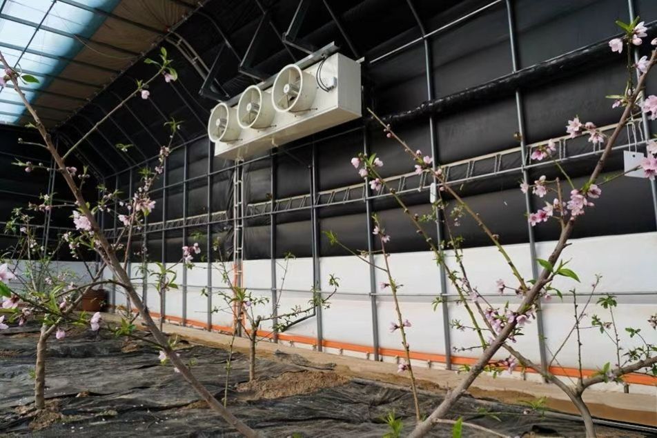 走进大棚内,满树桃花与棚外萧瑟的冬景形成鲜明对比。“我们这里的桃花,是全省最早开放的地方。” 秦瓴智联数字科技有限公司总经理丛家爽话语里满是自豪,“我们为整个日光温室搭建了一个可控的环境,在10月份我们采用了相变储冷的技术,提前给大棚进行一个强制休眠,预计在3月1日到3月19日,实现我们蜜桃的一个坐果上市。”棚内种植的“北京七号”是秦安蜜桃的核心品种,拥有国家地理标志产品认证和“中华名果”称号,其178天的生长周期已推进至80天,幼果正悄然生长,有望以极致品质与超早上市时间,填补全国早春高端蜜桃市场空白。