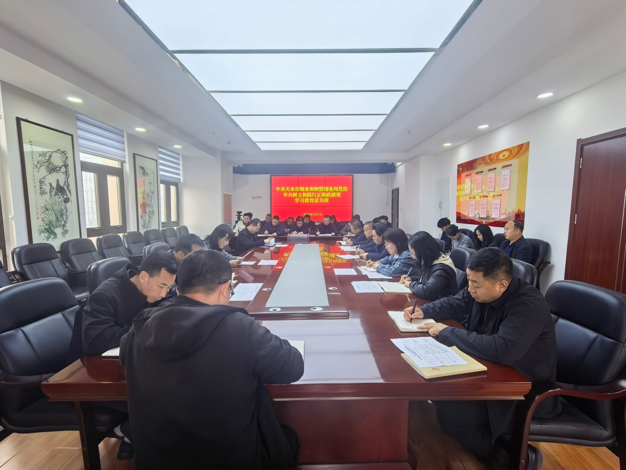 4月7日至10日,天水市粮食和物资储备局党组举办树立和践行正确政绩观学习教育读书班,通过集体学习、交流研讨、警示教育相结合的方式,深入学习习近平总书记关于树立和践行正确政绩观的重要论述和习近平总书记在党的二十届四中全会上的重要讲话精神以及视察甘肃重要讲话重要指示精神等相关内容,安排部署学习教育工作。市粮食和物资储备局党组主要负责人作动员讲话。