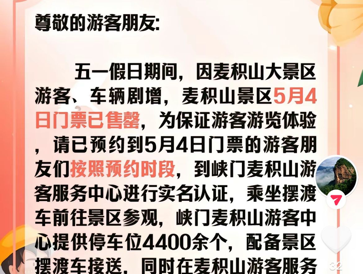 为积极应对客流高峰,今年的五一假期,麦积山大景区提前布局。麦积山景区山游客服务中心充分发挥综合调度功能,完善景区“限流、限量、错峰”具体举措,全面推行“分时段预约、分时段检票、分时段入园”的预约接待模式。积极应对客流高峰。对麦积山石窟栈道参观线路进行优化组合,开通2条应急参观线路。为了方便游客就餐,园区内设立多处小吃摊位,并在游客服务中心至麦积山景区沿线设置了10个摆渡车停靠点,游客如需到景区农家乐就餐,可以随时上下车。在麦积山游客服务中心实行统一调度、交通疏导,引导所有游览车辆统一驶入峡门游客服务中心停车场,为游客提供4487个停车位(配备新能源充电桩),组织游客乘坐景区大巴车前往景区参观游览,最大程度解决麦积山景区内停放车辆带来的拥堵及交通隐患问题。游客中心设有“麦积山数字影院”,游客可在环幕影院免费观看天水文化旅游影片。为疏导高峰期旅游交通,及时启用三级分流预案,在麦积山景区入口、麦积镇贾河、麦积山大景区游客服务中心路口,分三级设立游客分流引导站,管委会景区工作人员、交警驻点值守,将游客引导至仙人崖、石门、街亭温泉、净土寺等景区景点参观游览,并引导择日预购麦积山门票。同时,通过定向发送手机短信提醒的方式,将景区停止售票、交通疏导信息发送至途径三级分流点的游客手机上,切实提高疏导提醒的针对性和有效性。