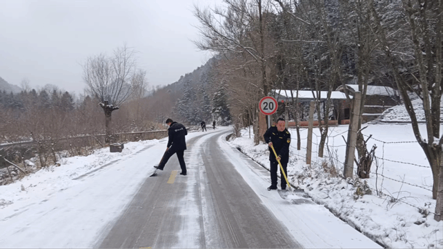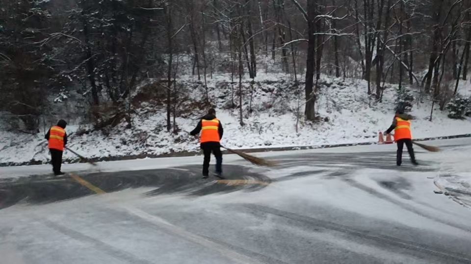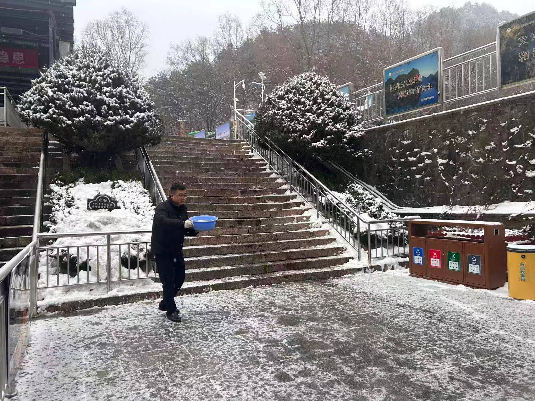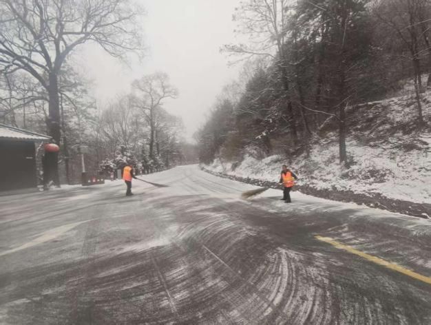 针对冬季气候特点,景区重点加强了安全巡查与应急保障。节前及假日期间,组织人员对主要游览步道、观景平台、停车场等区域进行了全面的安全隐患排查。面对近期的雨雪天气,景区及时开展清雪除冰作业,在陡峭、湿滑路段铺设防滑垫、设置醒目安全提示,并增派工作人员加强引导与提示,全力保障游客通行安全。
