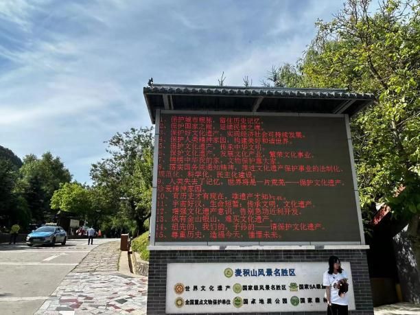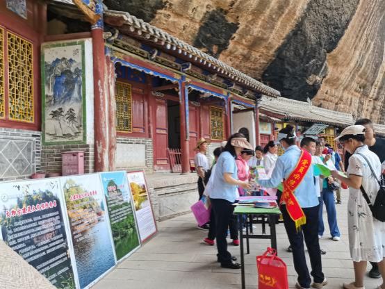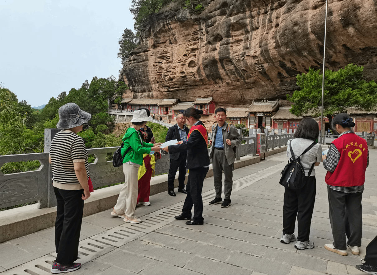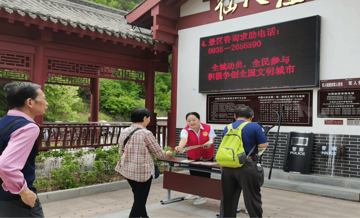 在麦积山、仙人崖、石门等景区活动现场,景区工作人员通过悬挂宣传横幅、展板、发放宣传资料、循环播放LED屏等方式,重点向游客宣讲了《中国公民出(国)境旅游文明行为指南》、《中国公民国内旅游文明行为公约》及《文明旅游十大提醒语》等内容,此次活动还通过文创产品、旅游商品展示等方式,让游客更加直观地了解麦积山大景区文化旅游资源。在麦积山大景区旅游品牌形象宣传及咨询服务台,工作人员通过宣传展板、宣传折页等形式,细心周到地为游客讲解了麦积山大景区五大景区特征、热门精品旅游线路、优质旅游产品及旅游便民惠民措施。