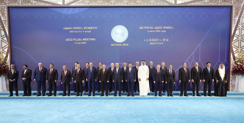 当地时间7月4日下午,国家主席习近平在阿斯塔纳出席“上海合作组织+”阿斯塔纳峰会并发表题为《携手构建更加美好的上海合作组织家园》的重要讲话。峰会开始前,习近平出席托卡耶夫为与会代表团团长举行的欢迎宴会并集体合影。新华社记者 鞠鹏 摄