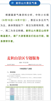 面对中秋客流高峰带来的管理和服务压力,假日期间景区全面实行网络门票分时预约制,通过官方微信、网站、手机短信、新闻媒体发布景区游客容量和票务预警信息,引导广大游客安全、合理、错峰出行,营造了和谐、舒适、安全的旅游环境,以优质的服务开启了麦积山大景区佳节之旅。