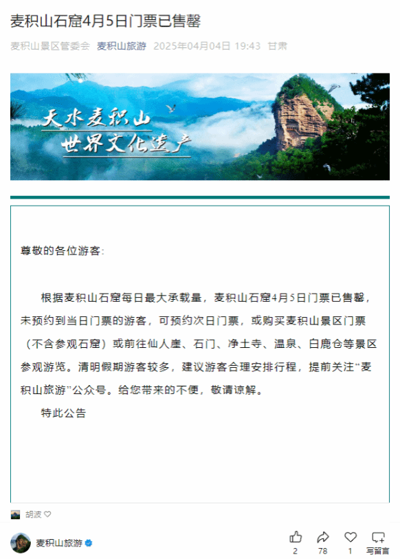清明时节,麦积山大景区风景宜人,吸引了众多游客前来踏青赏景,麦积山旅游再攀高峰,门票连续两日提前售罄。4月5日,麦积山大景区游客接待量达3.1万人次,其中麦积山景区接待1.7万人次,仙人崖景区接待1万人次,石门、净土寺等景区接待4482人次,接待旅游车辆超过5100辆。
