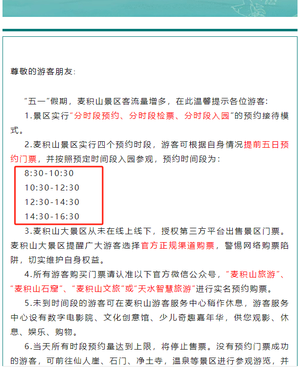 假日期间麦积山游客量暴涨,景区旅游服务工作压力剧增,市委市政府领导高度重视,对景区的旅游服务、车辆调度、消防安全、应急保障等工作进行全面的督查指导。景区牢牢把控旅游服务管理关键环节,坚守重点部位安全责任,确保景区平稳有序。