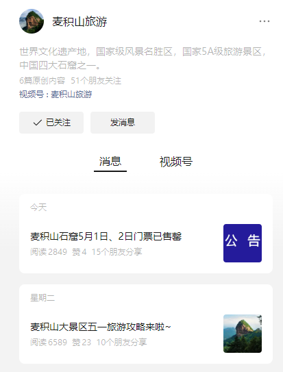 在着力做好景区安全部署工作和微笑服务的同时,麦积山大景区通过抖音、微信等新媒体平台,发布五一旅游攻略、实时游客容量、票务预警信息等宣传视频。在景区工作人员的共同努力下,五一小长假首日景区未发生任何安全事故和游客重大投诉事件。来自四川广元的游客陈先生表示,“这次来麦积山景区游玩,虽然人很多,但景区的管理很有秩序,工作人员和志愿者都很热情,让我们玩得很开心,也很放心。”