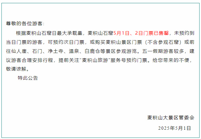 节日期间,景区全面推行“限流、限量、错峰”,“分时段预约、分时段检票、分时段入园”的具体措施,积极应对客流高峰。在麦积山游客服务中心实行统一调度、交通疏导,最大程度解决景区道路拥堵及交通隐患问题。5月1日、5月2日、5月3日门票已提前售罄,景区及时启动三级分流机措施,将游客分流引导至仙人崖、净土寺、温泉等景区参观游览,拓展了景区容量。