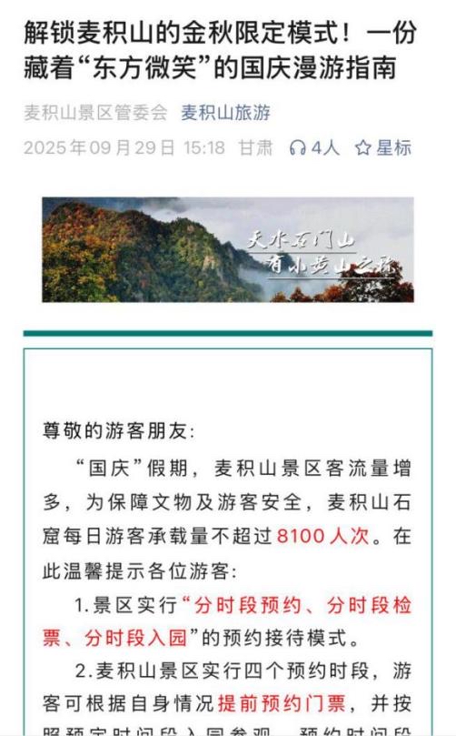 国庆假日前,麦积山大景区便依托抖音、微信等新媒体平台,持续发布景区服务举措、旅游攻略、特色活动预告,提前预热、制造热门话题,激发游客出行热情,相关视频总浏览量突破 15 万。