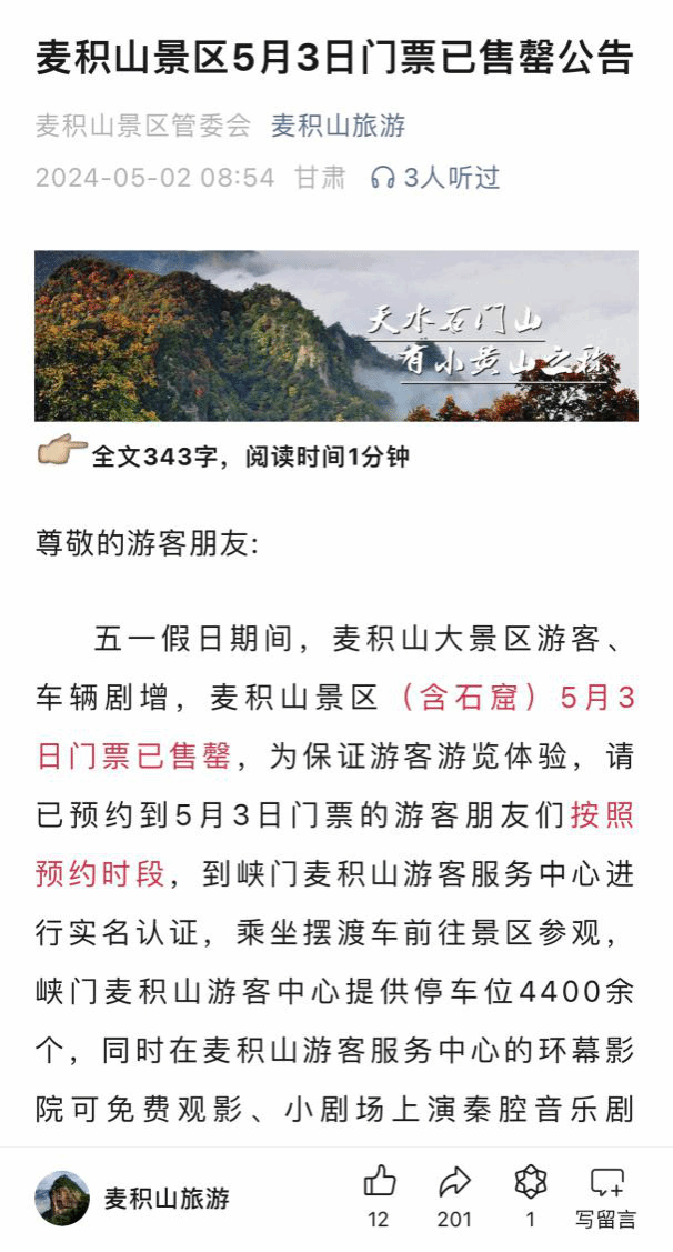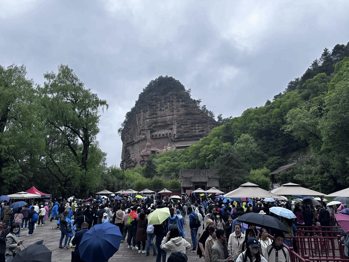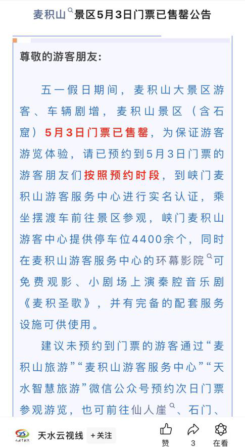 早上八点,麦积山石窟广场已是人山人海,5月2、3日麦积山景区门票预约量已达上限。麦积山大景区管委会通过网站、微信、抖音、景区电子屏、公告栏等渠道,及时向社会各界发布了停止售票公告,提醒游客提前预约,规划好行程,错峰出行。