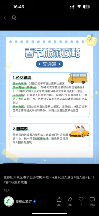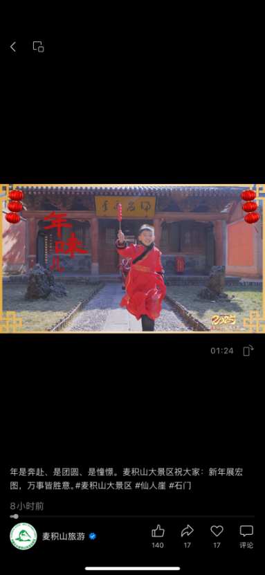 在做好游客良好出行体验保障措施的同时,麦积山大景区着力营造景区喜迎新春氛围,通过抖音、微信、小红书等新媒体平台,开展文化自然遗产保护、景区风光直播宣传,发布了春节假日旅游攻略、蛇年新春系列宣传视频,为游客群众送上麦积山的新年祝福。仙人崖景区、石门景区启动了冬春半价游活动,设置了免费开放日,和崆峒山、官鹅沟、伏羲庙等景区景点联合开展陇东南一票互游活动,带动淡季旅游市场回暖。依托仙人崖景区冰雪景观,打造了“冰雪奇缘”嘉年华旅游项目,打造景区冬春季旅游新爆点,吸引了众多游客前来打卡留念,登上了各大媒体平台。
