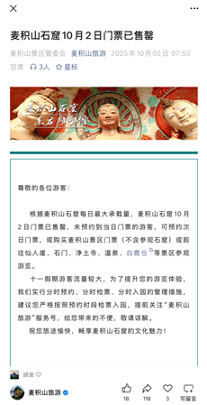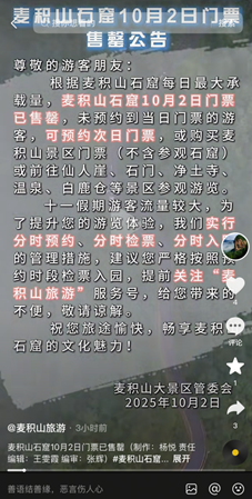 清晨八时许,麦积山石窟广场已聚集大量游客,当日门票在开门前即告售罄。景区管委会通过官方网站、微信公众号、官方抖音账号及景区现场标识牌、电子公告栏等多渠道,第一时间发布停票温馨提示,同步附上周边仙人崖、净土寺等关联景区的游览攻略,引导游客合理调整行程,错峰体验麦积山文旅魅力。