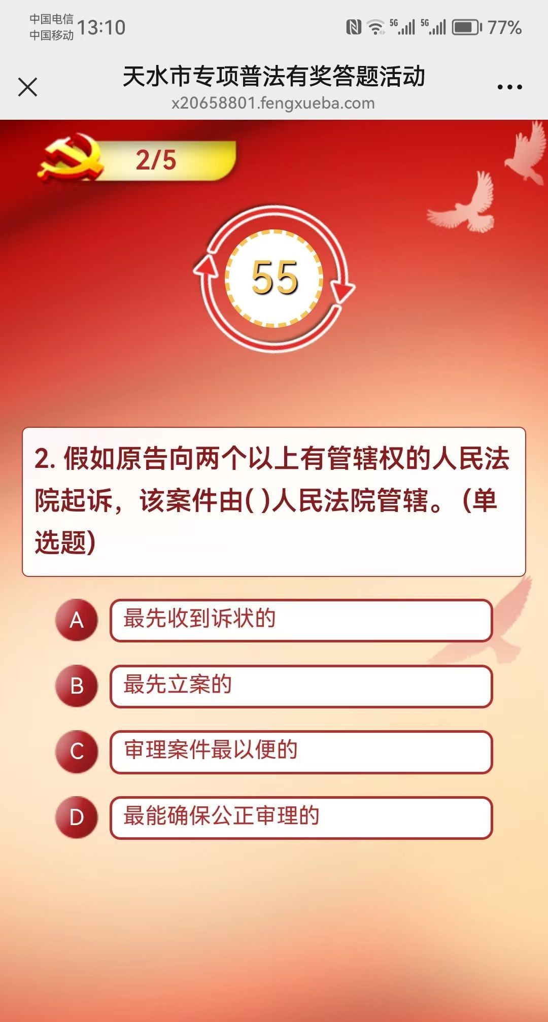 组织开展线上有奖答题活动。第十个“全民国家安全教育日”期间,联合市委政法委、市国家安全局组织开展为期一周的国家安全知识有奖竞答活动,累计访问量达12万余人次。2025年8月下旬至10月底,在“天水司法局”微信公众号开设专项普法有奖答题活动,围绕重点法律法规精选法律知识题库400道,组织动员全市广大干部群众广泛参与,累计参与答题21373人次,有效激发了全民学法的积极性和主动性,营造了尊法学法守法用法的浓厚氛围。