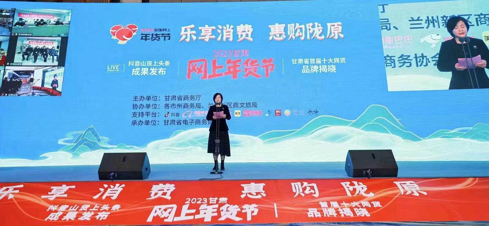 “2023甘肃网上年货节”启动仪式于2022年12月29日在兰州市主会场隆重举行。省内各市州分会场以网络视频连线方式同步开展,同频共振全面启动。