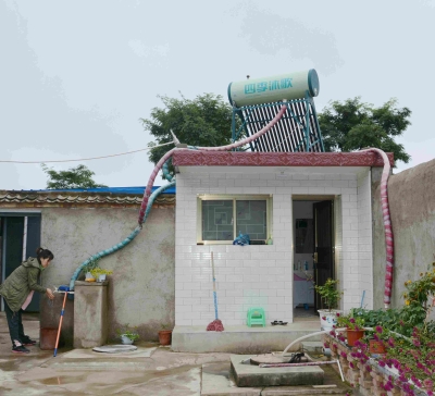 图二(小康不小康、关键看老乡。过去的干旱山区,修建一座房子,户主得提前10天找人帮忙驼水、买水,备足水源后才能开工建设。自来水到户后,不仅节省了修新房备水的劳力,新房建成后、还兴起了改厕革命。自来水接到灶台上、太阳能热水器接到卫生间。)