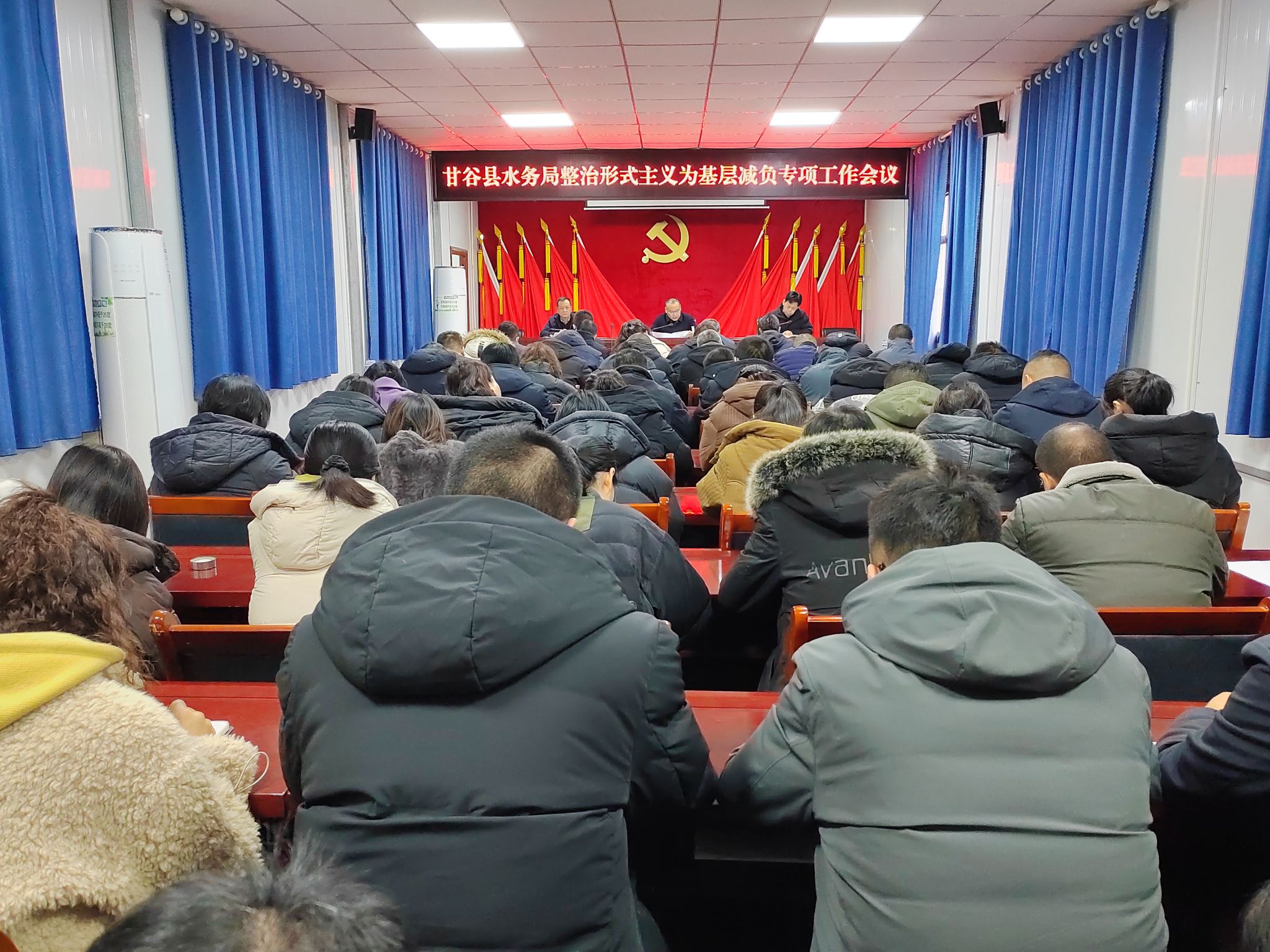 为进一步全面落实中央、省、市、县关于整治形式主义为基层减负的决策部署,聚焦水务主责主业真抓实干。1月26日,甘谷县水务局召开整治形式主义为基层减负专项工作会议。局党组书记、局长张克义主持会议,局党组成员、科级领导干部、各供水站站长、机关全体干部职工60余人参加会议。