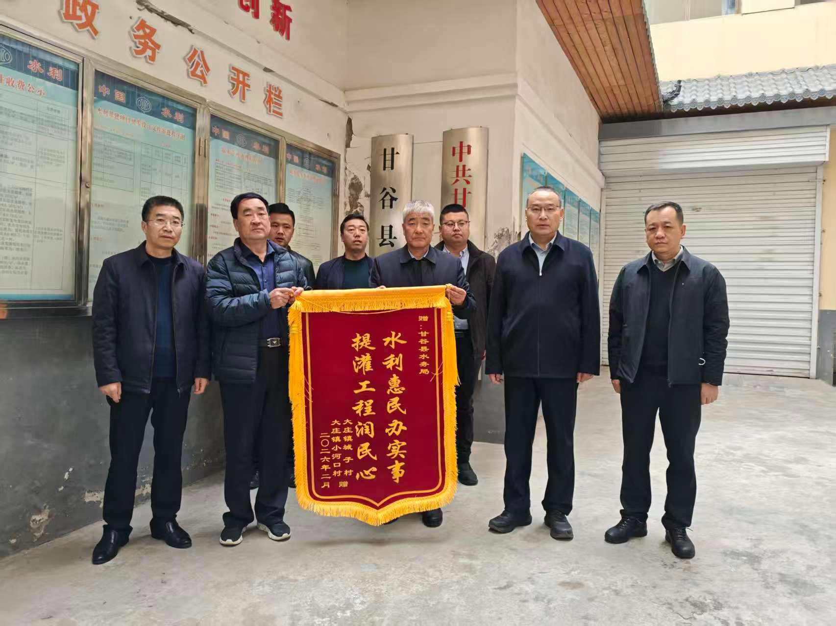 2月28日,大庄镇城子村、小河口村代表专程来到甘谷县水务局,将一面印有“水利惠民办实事 提灌工程润民心”的锦旗送到工作人员手中,对县水务局高效推进提灌工程建设、切实解决群众灌溉难题表示衷心感谢。