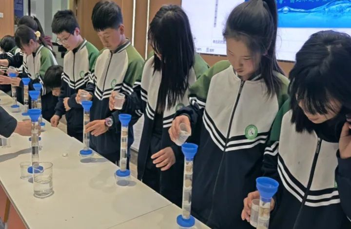 活动最后一个环节,一场生动直观的水净化科学实验将此次系列活动推向高潮。科普辅导员现场操作展示水净化装置,依次演示沉淀、过滤、吸附、消毒等核心净水工艺流程。通过模拟污水,同学们直观见证了水质从浑浊到洁净的全过程,详细了解了自来水厂净化原理及水质安全相关知识。活动中,学生们近距离观摩、沉浸式体验,科普辅导员还同步普及了家庭节水技巧与科学用水知识,引导同学们将科普知识与日常生活紧密结合,切实提升了节水护水实践能力。同时勉励大家从身边小事做起,以科技报国之志投身美丽张家川建设,让“强国复兴有我”从理念转化为实实在在的行动。