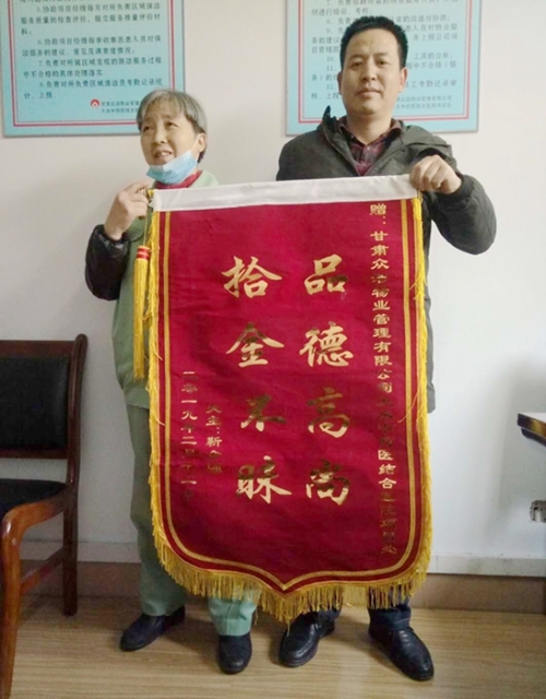 2月12日上午,天水市中西医结合医院(市二院)物业办公室迎来一面锦旗,这是麦积区伯阳镇保安村的一位村民特意制作的,特向保洁员沈淑云致敬,对她拾金不眛的高尚情操表示深深的谢意。