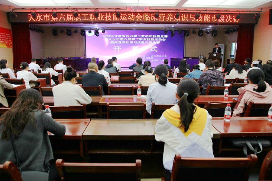 10月8日,由天水市卫生健康委、市总工会和市人社局主办,麦积区卫健局和天水市中西医结合医院(市二院)联合承办的“2023年甘肃省百万职工劳动和技能竞赛暨天水市第六届职工职业技能运动会临床营养知识与技能竞赛”在市二院多功能厅成功举办。市卫生健康委主任王定新,市总工会党组成员、经费审查委员会主任何付忠,麦积区卫生健康局局长陶俊杰,市二院党委书记曹宝国、院长唐志锋出席会议并讲话。开幕式由市二院副院长姚雄兵主持。来自全市10家医疗机构的30名参赛选手参加了竞赛。