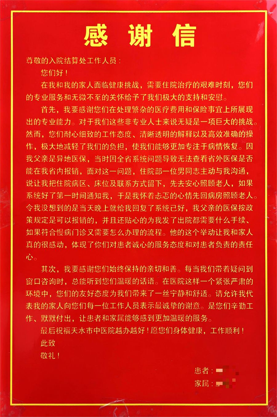 患者及家属的感谢信是患者对记账处工作人员业务能力的认可和热情服务的感谢,更是对医院的肯定与赞扬。
