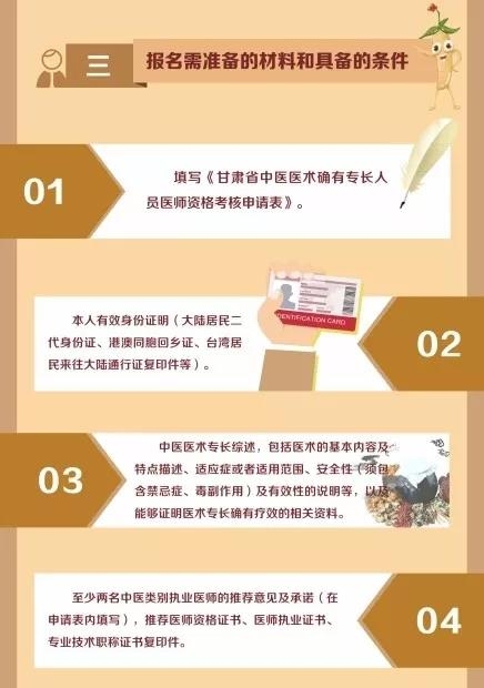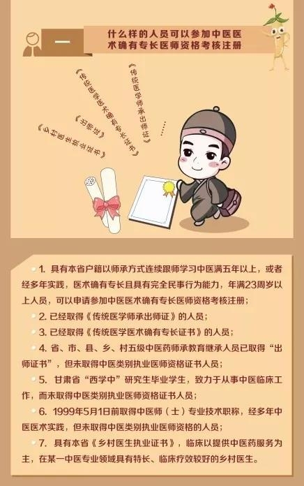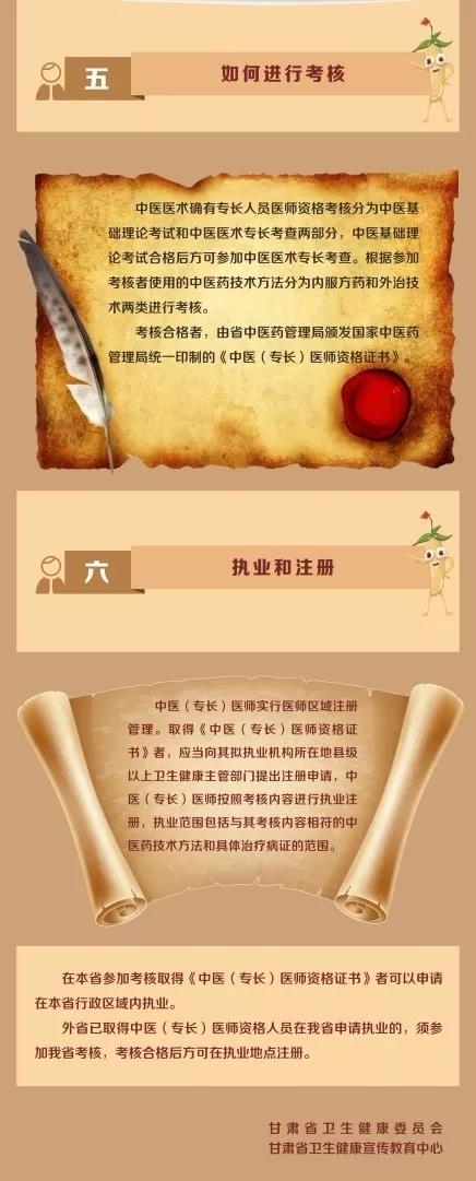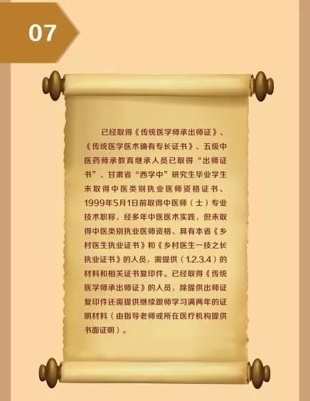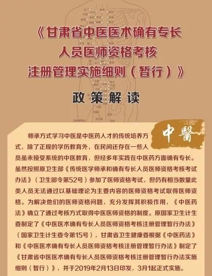 陇原健康 今天师承方式学习中医是中医药人才的传统培养方式,除了正规的学历教育外,在民间还存在一些人员虽未接受系统的中医教育,但经多年实践在中医药方面确有专长。虽然按照原卫生部《传统医学师承和确有专长人员医师资格考核考试办法》(卫生部令第52号)参加了医师资格考试,但仍有相当数量此类人员无法通过以基础理论为主要内容的医师资格考试取得医师资格。为解决他们的医师资格问题,充分发挥其积极作用,《中医药法》确立了通过考核方式取得中医医师资格的制度。原国家卫生计生委制定了《中医医术确有专长人员医师资格考核注册管理暂行办法》(国家卫生计生委令第15号),甘肃省卫生健康委根据《中医药法》和《中医医术确有专长人员医师资格考核注册管理暂行办法》制定了《甘肃省中医医术确有专长人员医师资格考核注册管理暂行办法实施细则(暂行)》,并于2019年2月13日印发,3月1起正式实施。