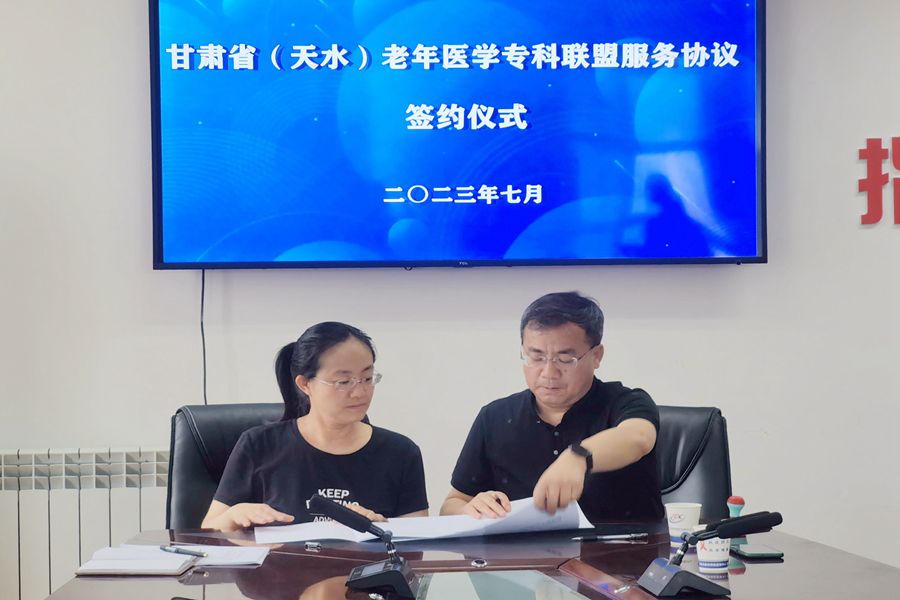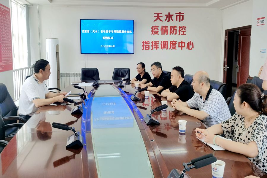 7月11日下午,天水市组织举行甘肃省老年医学专科联盟服务协议签约仪式。市卫生健康委党组成员、副主任杨智才出席仪式并讲话。