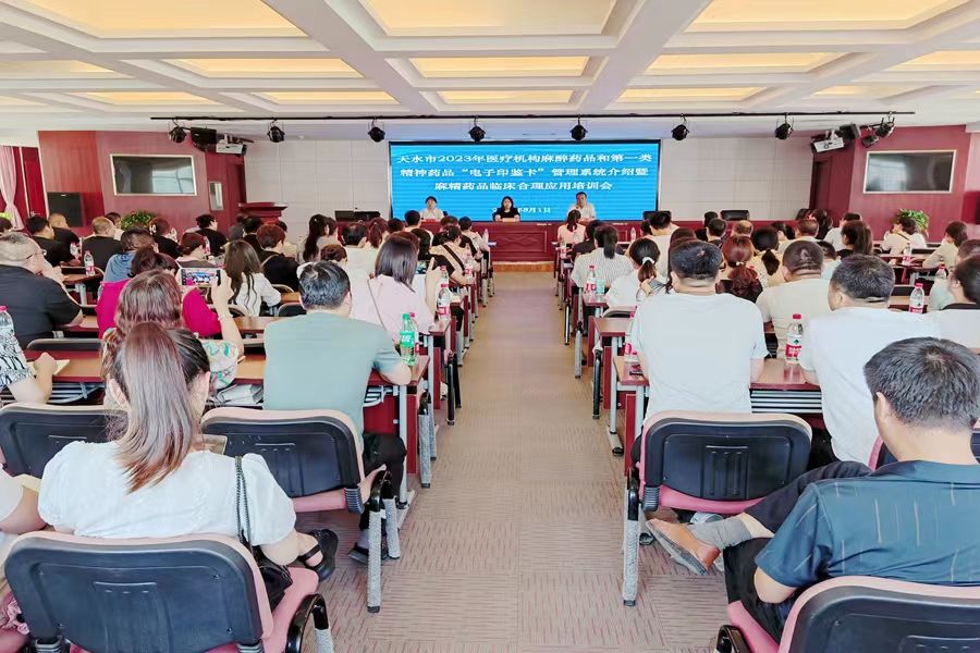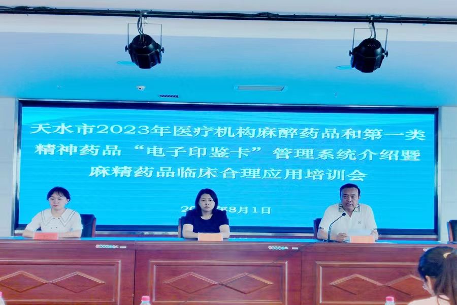为提高麻精药品信息化管理水平,提升医疗机构麻醉药品和第一类精神药品临床合理应用水平,8月1日,天水市举办医疗机构麻醉药品和第一类精神药品“电子印鉴卡”管理系统暨麻精药品临床合理应用培训班。市卫生健康委副主任杨智才参加开班仪式并讲话。各县区卫生健康局医政医管股负责人,各级医疗机构、民营医院药剂科负责人及系统操作员,市卫生健康委相关科室负责人共150余人参加培训。