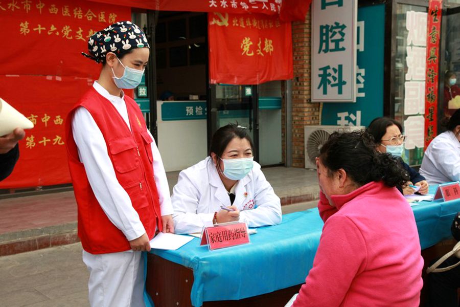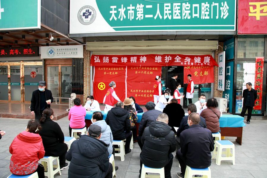 坚持健康义诊,惠百姓福音。3月5日,联合北道埠街道渭滨社区开展“弘扬雷锋精神 维护全身健康”义诊活动,热情接待每一位前来咨询就诊的患者,为他们提供健康指导,引导他们践行文明健康生活方式,提高健康素养水平。同时,组织志愿者参与到“义诊助残”口腔义诊活动中,为麦积区残疾人托养中心的患者测量血压,并进行健康知识、医疗常识、疾病预防等方面的宣教指导工作。