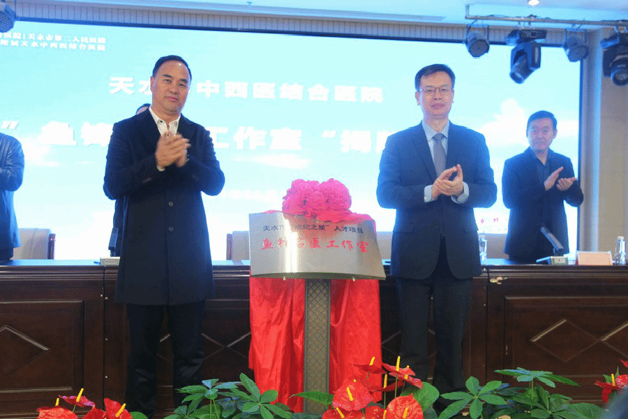 市委常委、组织部部长、市委人才工作领导小组副组长胡志勇与积水潭医院鱼锋教授共同为天水市中西医结合医院“鱼锋名医工作室”揭牌。