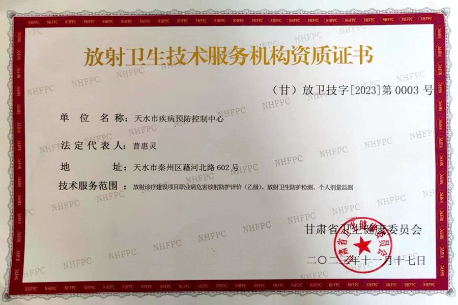 经过省卫生健康委监督保障中心专家组对我市放射卫生技术服务工作现场评审,日前,天水市疾控中心取得了甘肃省卫生健康委员会颁发的放射卫生技术服务机构资质证书。