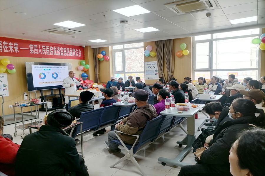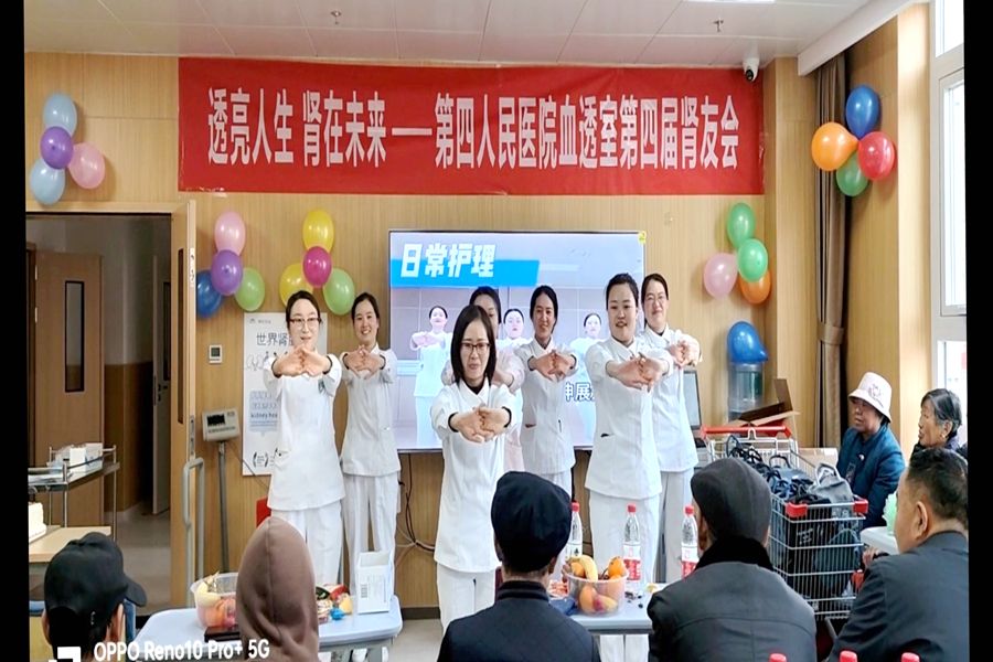 在2024年3月14日第十九个肾脏病日来临之际,天水市第四人民医院血液透析中心举办以“‘透’亮人生,‘肾’在未来”为主题的肾友会活动,旨在搭建医患沟通平台,提高肾友对肾脏病的认识和自我管理能力,传递积极向上的生活热情与正能量。血液透析中心全体医护人员、50余名患者和家属参加活动。