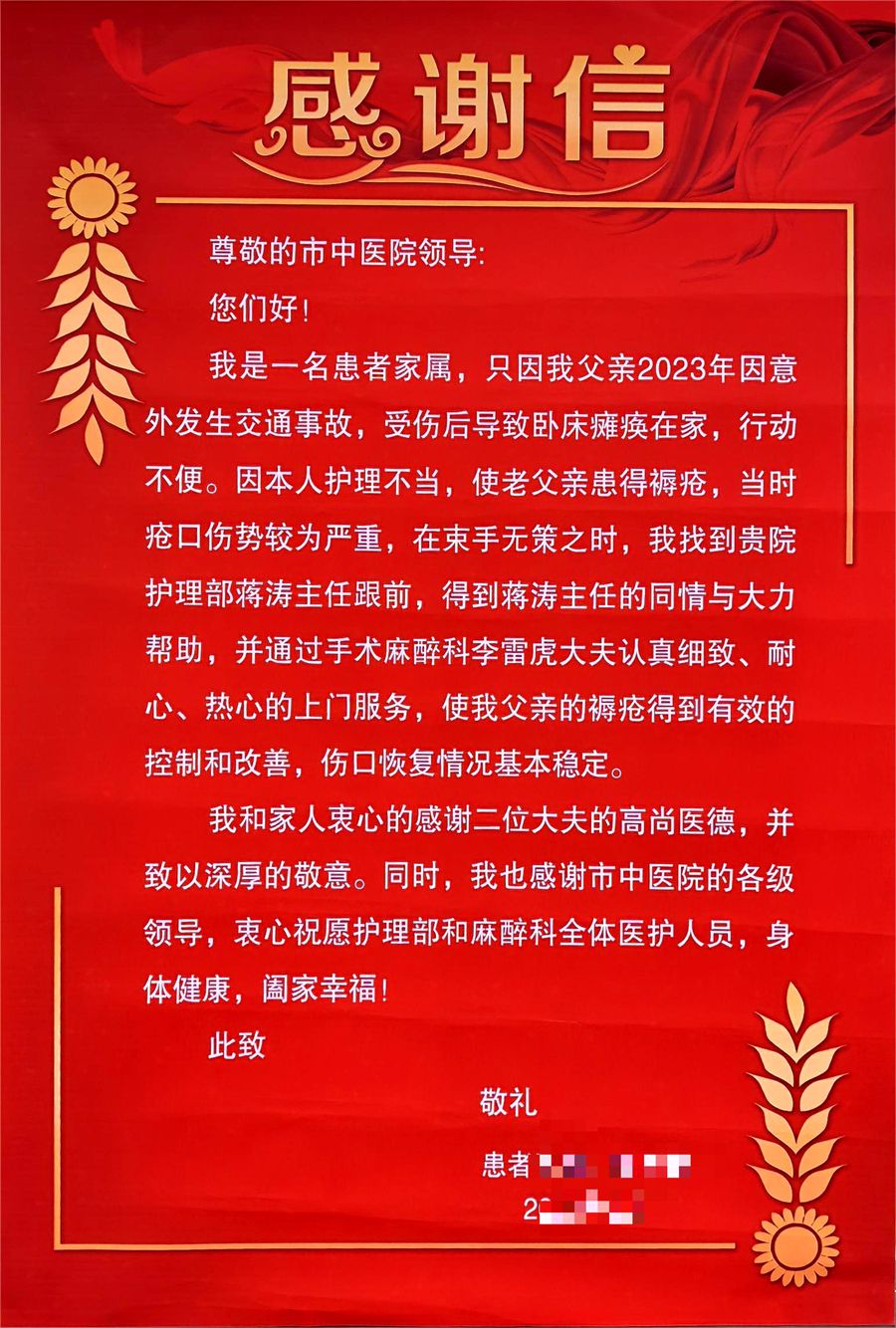 一封封普通的锦旗(感谢信)、一个个简单平凡的故事、一位位患者的真情实感,却演绎了一段段浓浓的医患情深。天水市中医医院全院干部职工将把患者的感恩和感激转化为工作的动力和源泉,从细节入手,从小事做起,以更好的医疗技术和更优质贴心的服务,为每一位患者解除病痛,把“三抓三促”行动落到实处。