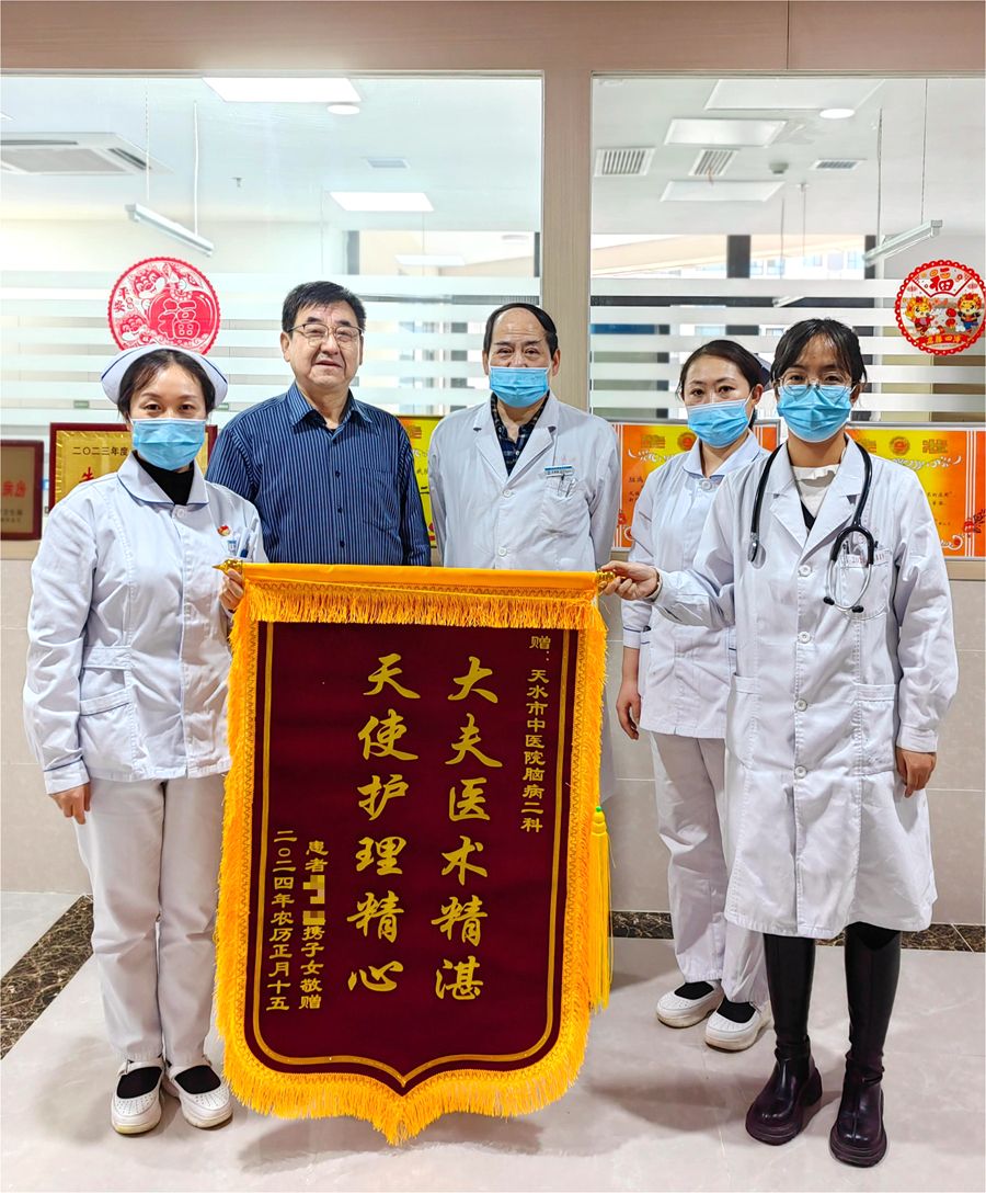 脑病科收到一面写有“大幅医术精湛 天使护理精心”的锦旗,感谢科主任王争胜、朱飞飞医生及全体医护人员高尚的医德、精湛的医术以及细致入微的医疗服务。