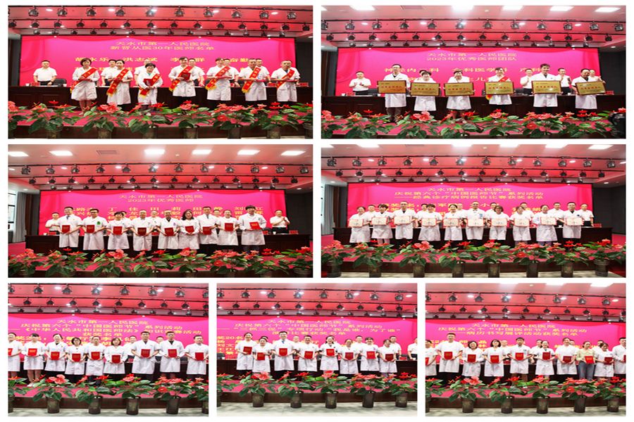 会议表彰了新晋从医30年医师、优秀医师团队、优秀医师以及庆祝医师节系列活动获奖人员。产科主任李群和儿童保健科负责人宇亚芬分别代表优秀医师团队和优秀医师作了发言。医务科科长李晶文带领新入职医师宣誓,庄严的《中国医师誓言》在会场回响。肾病内科雷霖主任发表了节日寄语,希望医务人员要具备温暖的人文情怀、人文素养和哲学思维,学习掌握传统医学理念,全心全意为广大人民群众服务。